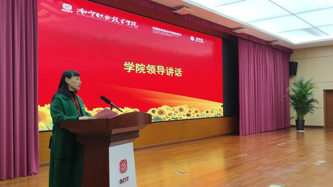 在庄严的国歌声中,会议拉开帷幕。伍玉凤代表学院党委肯定了学院学生会一年来取得的成就和为学校升本工作、学院改革及发展作出的积极贡献,对做好2024年的学生会工作提出了具体要求。最后她希望商学院青年学子都是学校立志、成才、报国、为民育人理念的传承者和践行者,希望同学们牢记使命,以饱满的政治热情,认真履行职责,脚踏实地、团结奋进、融入大局,参与学校建设发展,为拥抱南宁职业技术大学的璀璨未来、实现民族复兴的伟大梦想贡献青春力量!